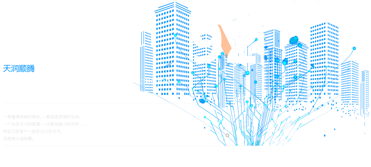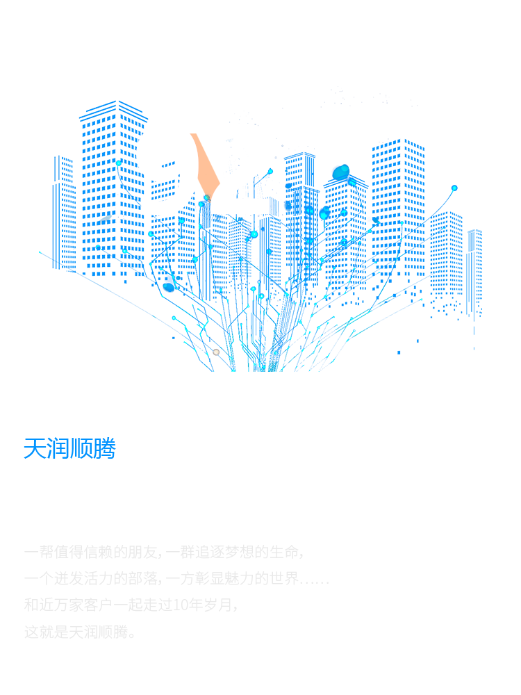 一幫值得信賴的朋友,一群追逐夢(mèng)想的生命, 一個(gè)迸發(fā)活力的部落,一方彰顯魅力的世界…… 和近萬家客戶一起走過10年歲月, 這就是天潤順騰。